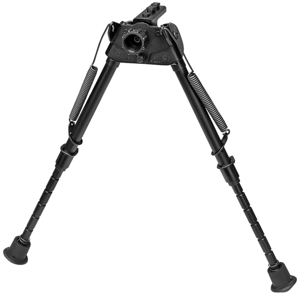Harris bipods have a sling attachment provision.Spring loaded folding legs are quickly adjustable for height.Manufactured with heat treated steel and hard alloys, bipods have a black anodized finish.This model has notched legs with a swiveling head to compensate for uneven terrain.