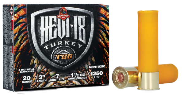 Hevi-shot goes ultra-dense with hevi-18 tss turkey.The 18 g/cc density pellets allow for smaller shot and higher pellet counts for the ultimate in long-range lethality.Incredibly tight patterns are achieve thanks to hevi-shot's unique, friction-free, sealed-in-the-shell spherical buffer.