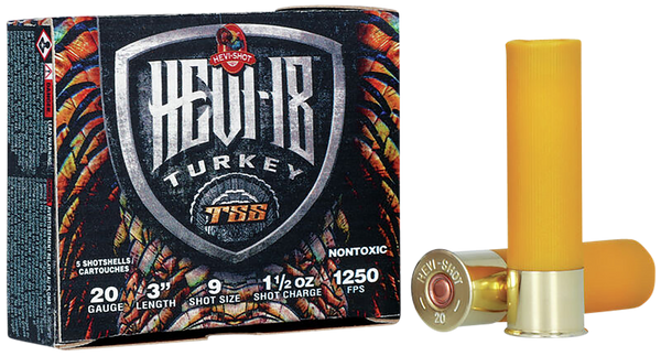 Hevi-shot goes ultra-dense with hevi-18 tss turkey.The 18 g/cc density pellets allow for smaller shot and higher pellet counts for the ultimate in long-range lethality.Incredibly tight patterns are achieve thanks to hevi-shot's unique, friction-free, sealed-in-the-shell spherical buffer.