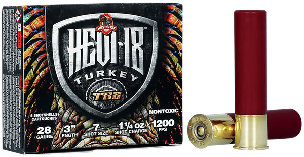 Hevi-shot goes ultra-dense with hevi-18 tss turkey.The 18 g/cc density pellets allow for smaller shot and higher pellet counts for the ultimate in long-range lethality.Incredibly tight patterns are achieve thanks to hevi-shot's unique, friction-free, sealed-in-the-shell spherical buffer.
