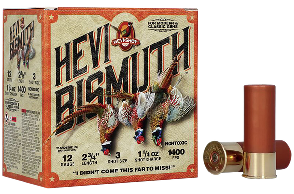 Hevi-bismuth is 22% more dense than steel, which allows you to drop down a shot size for the same lethality.Hevi-shot's bismuth is safe to shoot in modern and classic guns.Shot Material: BismuthGauge: 12 GaugeLength: 2.75"Ounces: 1 1/4 ozShot Size: 3Muzzle Velocity: 1400 fpsRounds Per Box: 25Boxes Per Case: 10Application: HuntingHazair: YesView more