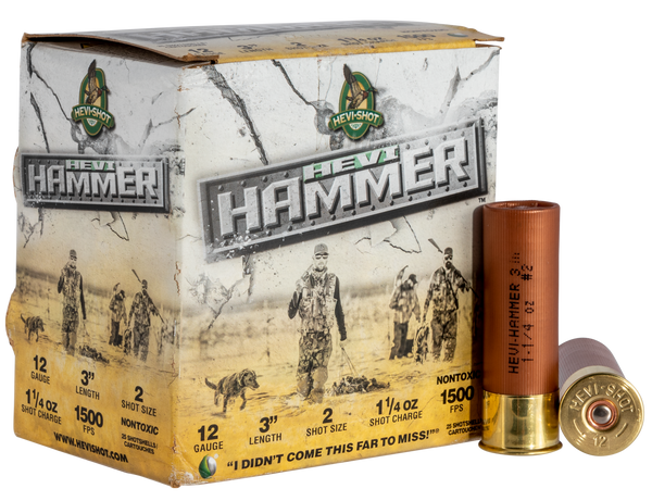 Hevi-shot's hevi-hammer leads to tighter patterns more knockdown power, and flat-out increases the chance of success in the field.It features 15% high-density bismuth, layered over 85% steel pellets.The bismuth layer is the same shot size as the steel.That small but mighty leading edge of bismuth packs nearly 50% more knockdown power than the steel layer at 40 yards.Application: HuntingGauge: 12 GaugeLength: 3"Ounces: 1 1/4 ozShot...View more