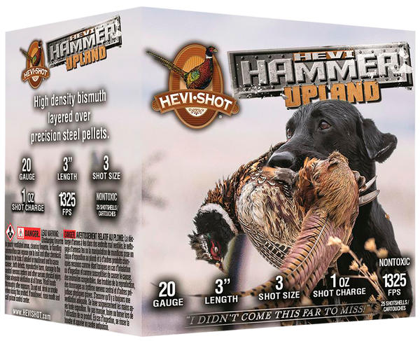 Hevi-hammer has 15% high density bismuth, layered over 85% steel pellets.The bismuth layer is the same shot size as the steel.That small but mighty leading edge of bismuth packs nearly 50% more knockdown power than the steel layer at 40 yards.Shot Material: Steel, BismuthGauge: 20 GaugeLength: 3"Ounces: 1 ozShot Size: 3Muzzle Velocity: 1325 fpsRounds Per Box: 25Boxes Per Case: 10Application: HuntingHazair: YesView more