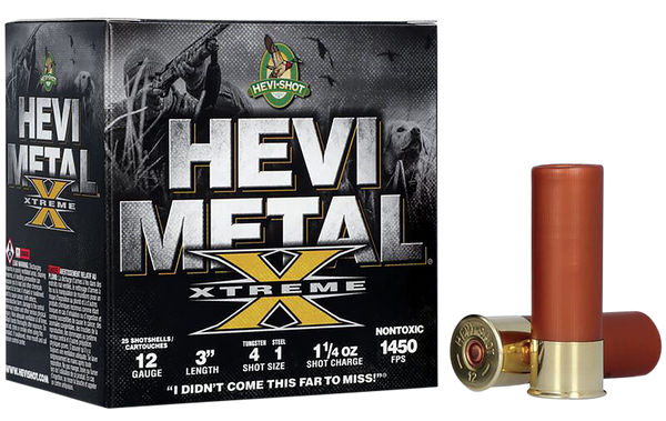 Introducing the next evolution of hevi-metal line up.For the most consistent pattern possible, we combined the renowned flitecontrol flex wad and our pattern density technology.This has a leading layer of 30% original hevi-shot 12 density tungsten over 70% precision steel pellets.Shot Material: Steel, TungstenGauge: 12 GaugeLength: 3"Ounces: 1 1/4 ozShot Size: 4 & 1Muzzle Velocity: 1450 fpsRounds Per Box: 25Boxes Per Case: 10Application: HuntingHazair: YesView more
