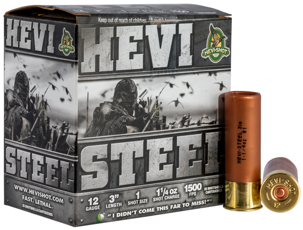 Hevi-shot's hevi-steel delivers major kinetic energy.It features an increase in speed that delivers 9% more energy at 30 yards and 8% at 40.More knockdown power and fewer crippled birds.Combining higher velocity, a best-in-class wad, and precision manufacturing techniques deliver the ultimate in performance.Application: HuntingGauge: 12 GaugeLength: 3"Ounces: 1 1/4 ozShot Size: 1Muzzle Velocity: 1500 fpsRounds Per Box: 25Boxes Per Case: 10Hazair: YesView more