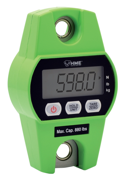Hme's digital game scale features a zero setting, tare function, and display lock.It has a max weight of 880 lbs, auto off and an over-load/low battery indicator.Includes two aa batteries.