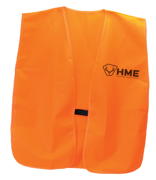 Hme's safety vest constructed of a soft and quiet 100% polyester with a hook & loop closure, open sides and a blaze-orange finish.It is machine washable and comes in the big boy size.