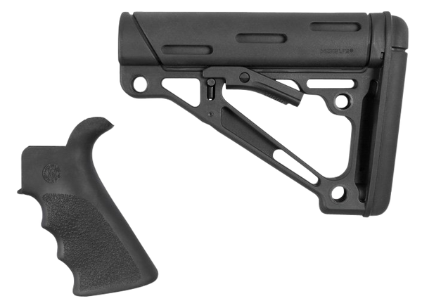 The ar overmolded 2-piece kit features a collapsible buttstock and a beavertail grip with finger grooves.This model has a black finish and is compatible with mil-spec buffer tube.
