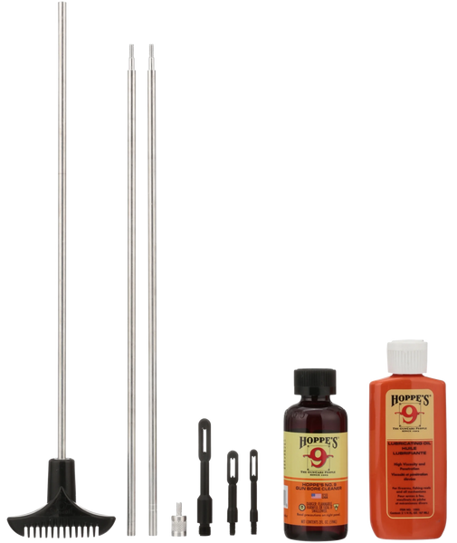 The rifle & shotgun cleaning kit includes no.9 solvent, lubricating oil, patches, rifle rod with rifle and shotgun adapter and slotted ends for rifles and shotguns.This cleaning kit comes in a clamshell package.