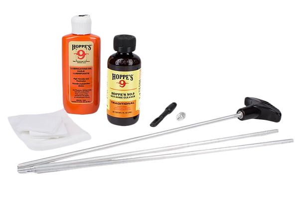 Hoppe's cleaning kit include: hoppe's no.9 solvent, 2 oz., hoppe's lubricating oil, 2.25 oz., round cotton patches, slotted ends and adapters, aluminum cleaning rod, a brush to fit your specific gauge.Brushes not included in universal sizes.