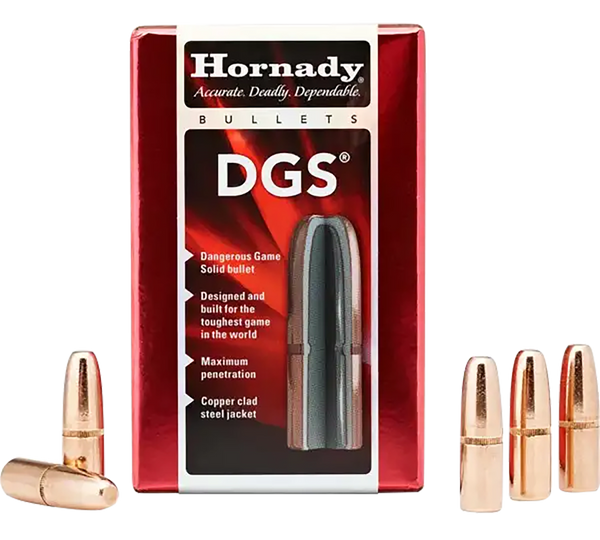 An aggressive, hard-hitting bullet with an attitude to match, hornady dgs bullets feature an advanced profile built of the toughest materials that penetrate through thick hide, dense muscle and hard bone delivering maximum stopping power.It features a wide, flat nose that delivers maximum energy upon impact, while resisting bullet deformation and deflection.Incorporating a very hard high antimony lead core with a copper-clad steel jacket, the bullet maintains integrity and overall weight retention.
