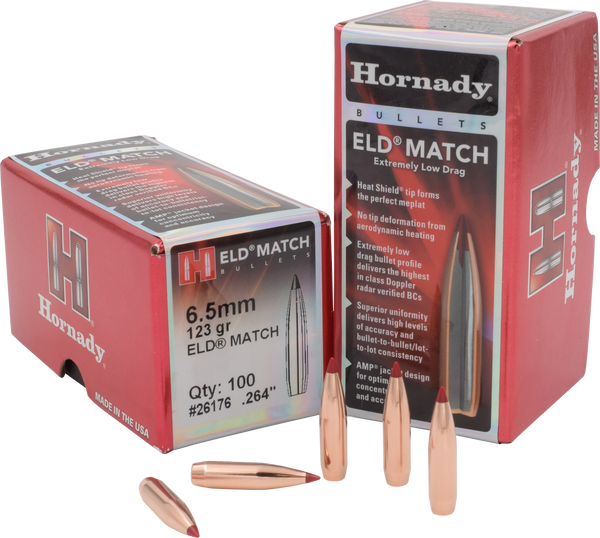 Hornady's eld match (extremely low drag match) bullets are technologically advanced, enhanced accuracy target bullets featuring heat shield tips with the ideal meplat (tip point) combined with numerous design features that deliver the highest-in-class ballistic coefficients, superior accuracy and extreme consistency from bullet to bullet, lot to lot.An optimum secant ogive and boattail design along with the heat shield tip produce a bullet with the highest possible ballistic coefficient in its class.The tip is immune to the effects of aerodynamic heating and retains its shape to provide a perfect meplat (tip) that is always the same shape.