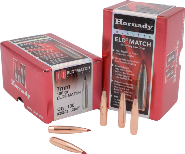 Hornady's eld match (extremely low drag match) bullets are technologically advanced, enhanced accuracy target bullets featuring heat shield tips with the ideal meplat (tip point) combined with numerous design features that deliver the highest-in-class ballistic coefficients, superior accuracy and extreme consistency from bullet to bullet, lot to lot.An optimum secant ogive and boattail design along with the heat shield tip produce a bullet with the highest possible ballistic coefficient in its class.The tip is immune to the effects of aerodynamic heating and retains its shape to provide a perfect meplat (tip) that is always the same shape.