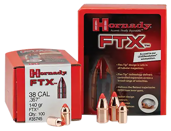 Hornady's ftx rifle bullets revolutionized lever gun ballistics, creating a level of performance for these popular firearms.The patented flex tip, combined with its secant ogive design, creates an aerodynamic bullet with a thinner, tapered front section and extended bearing surface for much higher ballistic coefficients.The high antimony lead core is locked to the jacket with an interlock ring, resulting in reliable performance and deep penetration on large or heavy-bodied game animals.