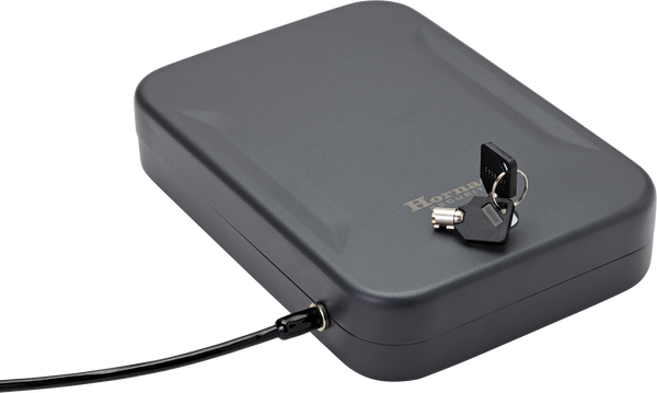 Hornady security lock box provide secure storage for handguns and other valuables at home, on a nightstand, in the car or when traveling.Fits 1911 size pistols and some 4" revolvers.Includes a 4' steel security cable that secures to any stationary object including a vehicle seat or heavy piece of furniture.Comes with two keys.