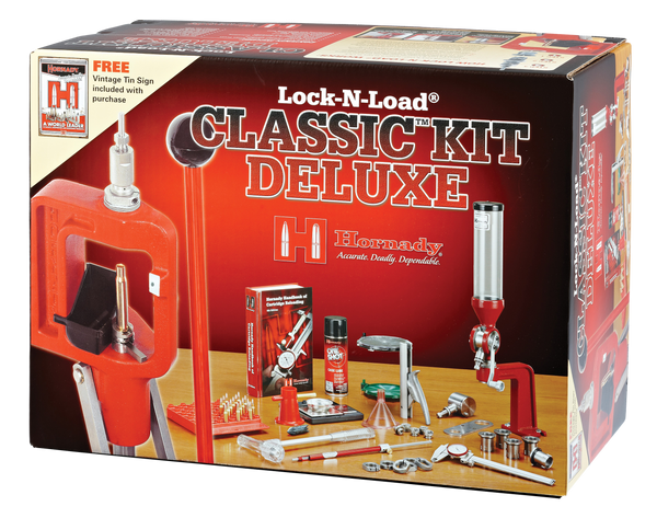 The lock-n-load classic kit deluxe represents the most complete single stage reloading package hornady offers.This kit includes lock-n-load classic single stage press, powder measure, digital scale, hornady handbook of cartridge reloading, primer catcher, positive primning system, handheld priming tool, universal reloading block, chamfering and deburring tool, powder trickler and funnel, one shot case lube, three lock-n-load die bushings, sure-loc loc ring, powder measure stand, shellholder pack, kinetic bullet puller, lock-n-load oal gauge straight, vintage tin sign, pistol rotor and metering assembly, and a steel dial caliper.