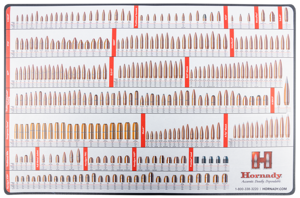 The reference tool for your reloading bench.This non-skid bullet mat features the hornady bullet line with corresponding caliber, diameter, weight, ballistic coefficient, sectional density, and item number.