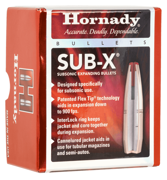 Sub-x bullets deliver big results, designed to provide deep penetration below the speed of sound, sub-x features a lead core.Long grooves in its gilding metal jacket combine with its flat profile and the patented flex tip insert within the bullets hollowpoint cavity to help it expand reliably at low velocities.Cannelures provide positive case crimp, making sub-x ideal for semiautomatic weapons.
