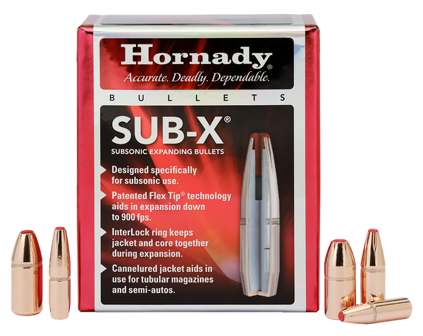 Sub-x (subsonic expanding) bullets deliver big results without a big bang.Designed to provide deep penetration below the speed of sound, sub-x features a lead core.Long grooves in its gilding metal jacket combine with its flat profile and the patented flex tip insert within the bullets hollow point cavity to help it expand reliably at low velocities.Cannelures provide positive case crimp, making sub-x ideal for semiautomatic weapons.