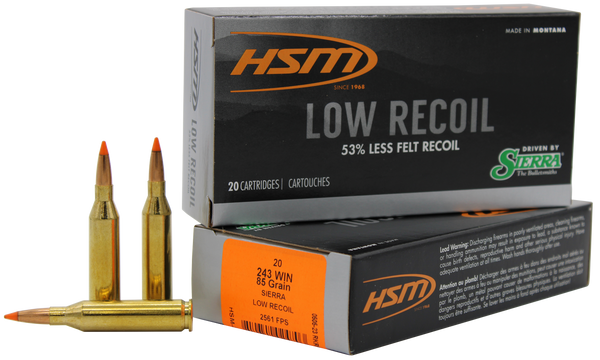 The hsm low recoil rifle rounds all feature full, standard weight for caliber hunting bullets.There is no compromise in performance and accuracy when compared to bullets found topping other low-recoil ammunition.Hsm partnered with world-renowned sierra bullets in developing these hsm proprietary bullets featuring a distinct hsm orange polymer tip.They are as technologically advanced as has yet been encountered.Specifications: 243 win/85 gr/orange polymer tip/20 per box/25 cs