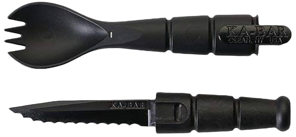 The ka-bar spork is equipped with a fork/spoon combo and has a 2.5" plastic serrated knife in the handle.The knife is accessed by pulling the spork in opposite directions from each extreme end.The spork is 6.87" overall and has a blade length of 2.5".**hint--avoid gripping the flat panel area in the middle of the spork, this is actually part of its lock.The tighter you hold...View more