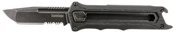 The interstellars blade slides out-the-front with a manual button mechanism.The sliding button lock is safe, reliable and easy to use.It's complete with a four-finger grip for work tasks; partially serrated, tanto blade; a practical bottle opener integrated into the backspacer; 8cr13mov blade takes a sharp edge and is easy to re-sharpen when needed and blackwash finish helps hide use scratches.Includes pocket clip.