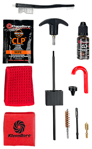 The classic cleaning kit includes: kleen-bore rigid black rod with swivel handle; rod extension #8-32 threads; double end nylon bristle brush; 2 oz brekfree clp; black steel patch holder; phosphor bronze bore brush; polymer muzzle guard; silicone cloth; cotton cleaning patches all in a polypropylene case.Caliber Or Gauge: 9mm/38/357Bristle Type: NylonIncludes: Rod, Extension, Brush, Holder, Cloth, PatchesThread Pattern: #8-32Case Material: PolypropyleneView more