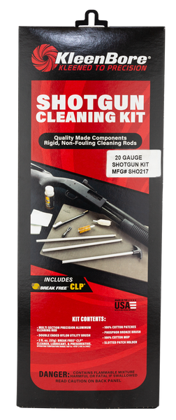 The shotgun classic kit is ideal for your 20 gauge shotgun.The kit includes: 32" kleen-bore 3-piece aluminum rod (which accepts 10,12,16,20,28 & 410 accessories and 5/16-27 american standard threads); double end nylon bristle gun brush; 20 ga phosphor bronze bore brush; 20 ga cotton bore mop; slotted shotgun patch holder; 2 oz breakfree clp; silicone cloth; shotgun cotton cleaning patches all in a reusable carrying/storage case.