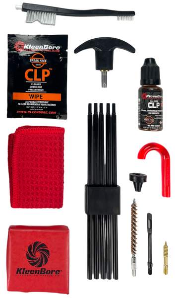 The classic cleaning kit includes: 30" kleen-bore rigid black rod with swivel handle; rod accessory adaptor to accept #8-32 threads; double end nylon bristle brush; 2 oz brekfree clp; black steel patch holder; phosphor bronze bore brush; polymer muzzle guard; silicone cloth; cotton cleaning patches all in a polypropylene case.Caliber Or Gauge: 243,25,6mm,6.5mmBristle Type: NylonLength: 30"Thread Pattern: #8-32Case Material: PolypropyleneView more
