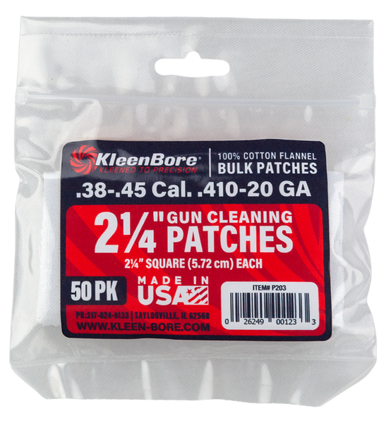 Kleen-bore gun cleaning patches helps keep the bore of your firearm clean and protected.These patches are precision cut to ensure the proper fit and maximum cleaning performance when used with kleenbore jags.The cotton flannel patches provide maximum absorbency and bore protection.It is compatible with.38 -.45 cal and.410 - 20 gauge firearms.Size: 2.25"Quantity: 50 Per PackMaterial: CottonSuitable For: FirearmsView more