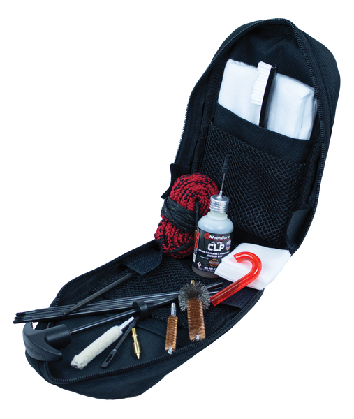 The kleen-bore tactical/police long gun cleaning kit includes: 30" kleen-bore rigid steel black rod; rod accessory adaptor with 8-32 thread end; double end nylon bristle gun brush; barbed point brass jag; phosphor bronze bore brush; cotton bore mop; 2 oz breakfree clp; 1 oz pro-shot bio 4x lp needle oiler; silicone cloth; cotton cleaning patches all in a heavy duty reusable carry/storage case.