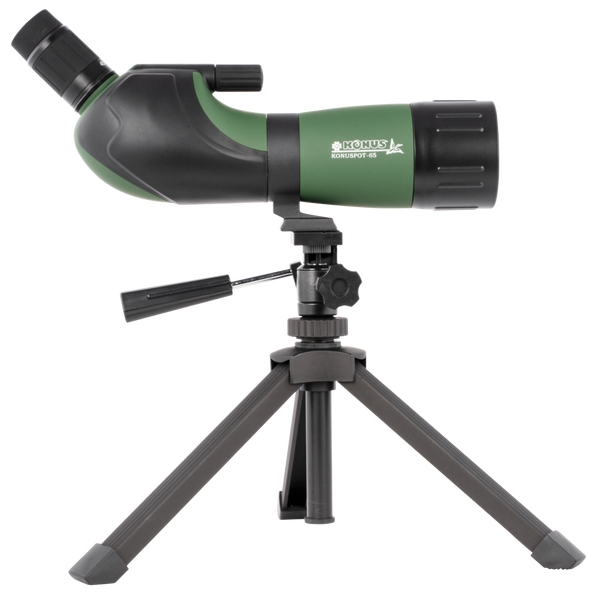 Konuspot-65 is a high quality prismatic spotting scope, ideal for observing and way laying, thanks to a 45 degrees tilting eyepiece.Zoom magnification is useful to progress in discovering details.You can quickly pass from 15x to 45x.Includes camera adapter, smartphone adapter, table tripod and protective case.10 yard close focus.