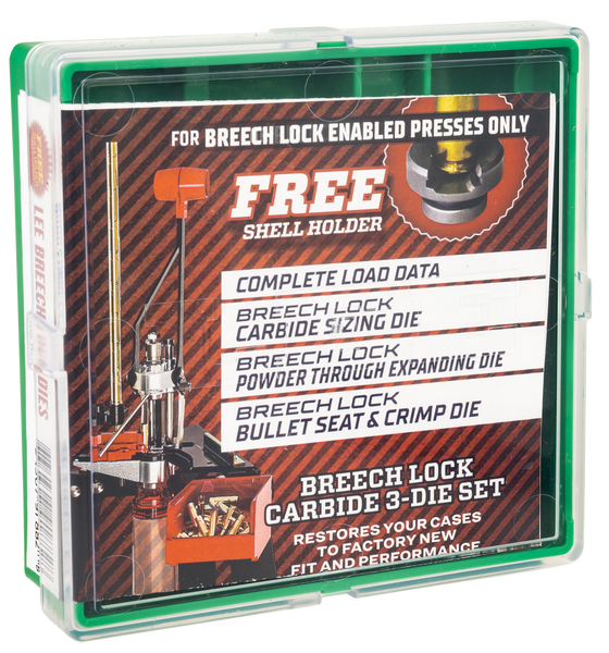 Lee precision breech lock 3-die set restores your cases to factory new, fit, and performance.This 3-die set comes with breech lock carbide sizing die, breech lock powder through expanding die and a breech lock bullet seat & crimp die.It also includes a free shell holder.This 3-die set is for breech lock enable presses only.