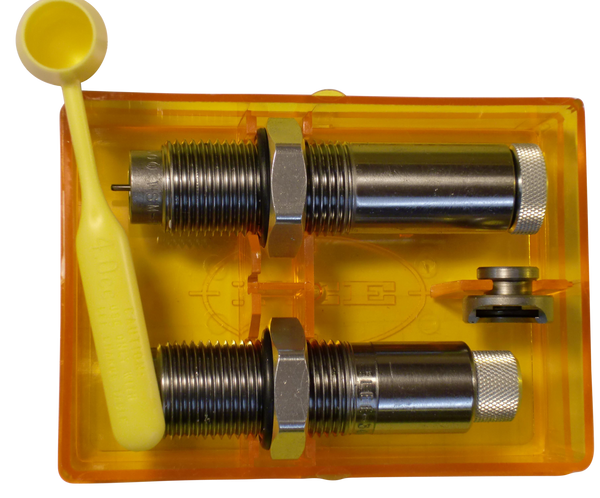 Lee's pacesetter 2-die set includes full length sizing die, bullet seating die, universal shell holder, powder dipper and instructions/load data.