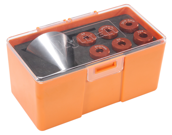 Lyman's precision funnel set is the perfect system for the serious reloader.The brass smith precision funnel set is made to be completely static free, no more powder clinging to surfaces which can happen with lightweight plastic funnels.The solid construction and quality of the brass smith precision funnel set will be apparent in its first use.This is no "one size fits all" funnel, it uses precision machined, caliber specific inserts to properly fit the case neck.The inserts can be quickly and easily installed by simply pushing them into place and then pulling them out when changing calibers.The brass smith precision funnel set also comes with a padded storage case that neatly stores extra inserts when not in use.The funnel comes with inserts for.22, 243/6mm, 25/6.5mm, 270/7mm,.30, and.338 caliber rifle cartridges.