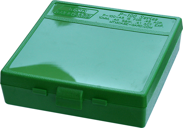 Mtm's case-gard p-100 series offers the perfect ammo carriers for the handgunner at the range.Each box holds 100 rounds, safeguarding from moisture and dust.It is ideal for storing reloads and is stackable.The textured box has an easy to grip, scuff-resistant surface, a snap-lok latch and durable, mechanical hinge.Each p-100 is supplied with a load label for recording custom loads.