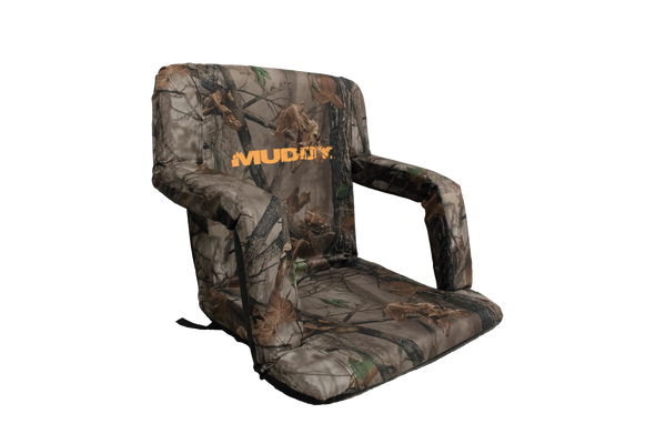 The muddy deluxe stadium chair has built-in armrests and bench seat and attaches to any 5 or 6 gallon bucket.