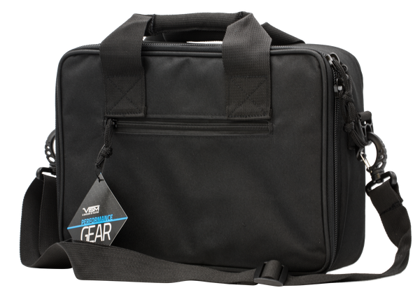 The double pistol range bags main pistol compartment can fit two standard full framed semi-auto pistols.The compartment floor is lined with loop fasteners and comes with four hook & loop straps to secure the pistols in place.There are two large flaps that close over the pistols to help secure them in place and to protect them from being scratched.The 9" long magazine pouches run nearly the full width of the bag with hook & loop flaps on both ends.This allows you to use sub-compact, double stack standard capacity magazines, and even 30+ extended magazines.The mag pouches can hold up to 10 standard capacity double stack magazines.There are also extra loop fasteners on the mag pouches for name tape or moral patches.Elastic loops for holding additional mags, shooting glasses, etc.Two slot pockets to hold a pen/marker or tools.Large heavy duty zippers on the main compartment with lockable metal zipper pulls (padlock not included).Heavy duty padded carry handles and an adjustable shoulder strap with quick connects are included.There is also an external zippered compartment to hold paperwork, your car keys, etc.On the back side there is a 5" x 3" loop fastener patch to attach a name tape or moral patches.