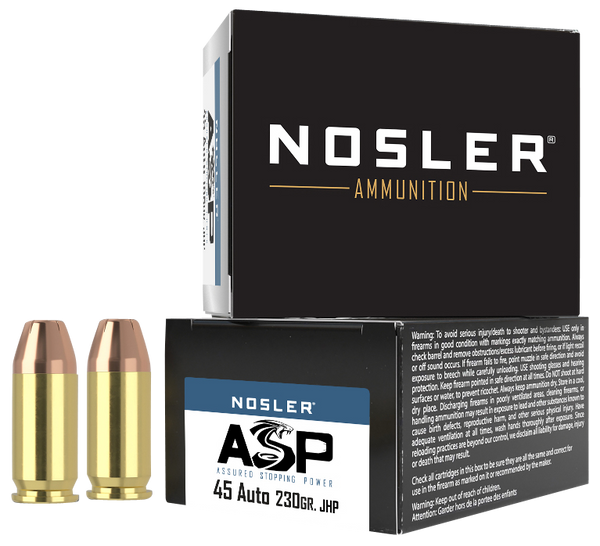 Nosler's assured stopping power (asp) ammunition line combines match-grade accuracy with a reliable, effective, hollow-point bullet.Evolving from the match grade ammunition line, asp ammunition is loaded with the same quality and attention to detail that match grade users have come to expect, with the addition of an expanding hollow-point bullet designed specifically for duty and defensive use.Loaded in nosler head-stamped brass, and utilizing quality components throughout, the asp ammunition can be relied upon to perform in a wide variety of applications and ranges.Equally, at home on duty or in a defensive role, law enforcement professionals and civilians alike can rest assured that asp ammunition will perform when needed.