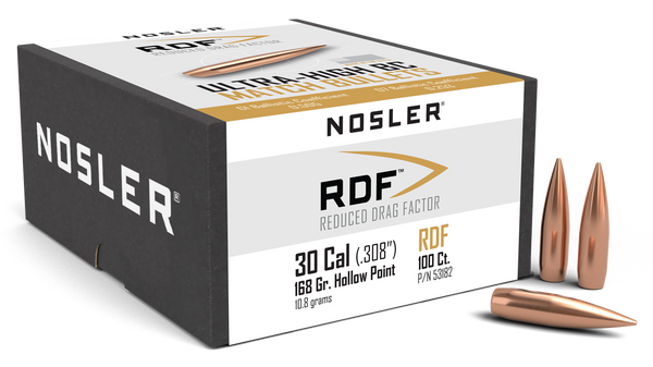 For those wanting to squeeze the most performance from their competition rifle, nosler's rdf (reduced drag factor) match bullet line is the ideal choice.The rdf line was designed from the ground up to provide exceptionally high bcs, which create the flattest trajectory and least wind drift possible.The keys to the rdf's outstanding performance are nosler's meticulously optimized compound ogive and long, drag-reducing boattail, which make handloading a snap and create an incredibly sleek form factor.Rdf bullets also have the smallest, most consistent meplats of any hollow point match bullet line, so there is no need to point or trim tips.