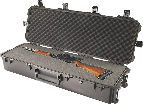 Pelican's strom long case features six press and pull latches and two double layered, soft grip handles.It also features two padlockable hasps, in-line wheels, a vortex valve, and powerful hinges.This model's interior dimensions are 44" x 14" x 8.5".