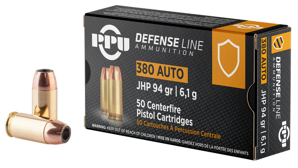 Defense line handgun ammunition is loaded with ppu's innovative, proprietary jacketed bullets that maximize stopping power by providing improved expansion and maintaining bullet density.When protecting yourself and others the stakes are always high, depending on ppu quality, performance, and dependability.Caliber: 380 ACPBullet Type: Jacketed Hollow PointBullet Weight: 94 grMuzzle Energy: 191 ft lbsMuzzle Velocity: 951 fpsRounds Per Box: 50Boxes Per Case: 20Application: Home DefenseCasing Material:...View more