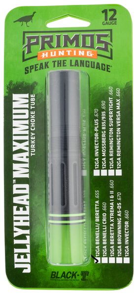 The jelly head maximum utilizes an extended taper and fluted ports to tighten patterns up to 20% and reduce recoil, allowing hunters to stop gobblers in their tracks at even longer ranges.Primos utilizes proprietary black-t coating, the same protective barrier utilized by the military's special forces to prevent rust and corrosion on weapons in the harshest environments, like turkey hunting.Designed to shoot hevi-shot, copperplated lead or regular lead.90% pattern density at 40 yards.*note- this choke will not fit the benelli sbe ii, m2 or beretta xtrema, a400.