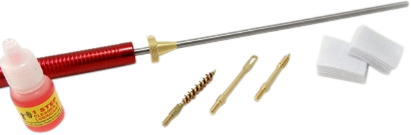 This cleaning kit by pro-shot is suitable for.22 caliber competition pistol.Includes 8" working length micro-polished stainless swivel handle rod, brass muzzle guard,.22 cal.Spear tip jag,.22 cal.Brass core/ bronze bristle bore brush ,brass patch holder, starter sample of 1 1/8" sq.100% cotton flannel patches ,.25 fl.Oz.1step clp dropper bottle and a reusable tube with hang c.Ap