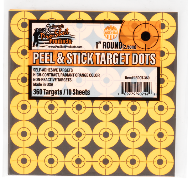 Pro-shots target dots create instant bull's-eyes for all types of target practice.The high contrast, radiant orange color makes it easier to see a sharper sight picture and bullet holes more clearly for better scores and smaller groups.Type: Target DotsSize: 1"Quantity: 10 Pack/360 TargetsMaterial: PaperIllustration: 1" DotImpact Enhancement: NoMount Type: Self-AdhesiveTarget Color: OrangeView more