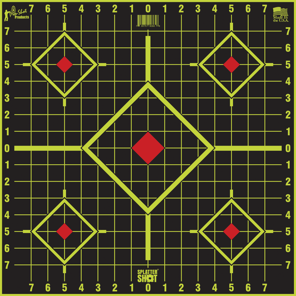 Pro-shot's splattershot peel and stick sight-in targets main center target is used for sighting-in purposes, the four smaller targets can be used for confirmation of sight-in groups or testing various ballistic loads.Bullet holes are revealed with bright green rings.1" numbered grid lines for scope adjustments.