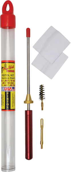 This pistol kit comes with 6.5" stationary handle with a stainless steel, micro-polished rod, brass patch holder, muzzle guard, brass core/nylon bore brush and a reusable tube with hanging cap.