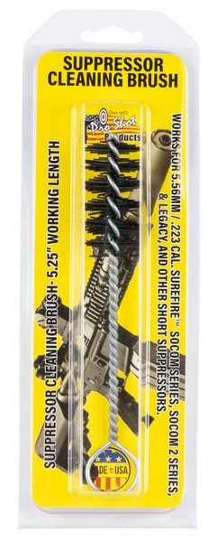 Suppressor cleaning brush helps keep your suppressor operating in top performance.For use on 5.56mm/223 rem rifles that attach to the host weapon via a surefire muzzle device.Includes- surefire socom series, socom series 2, legacy, warden and other suppressors less than 6".
