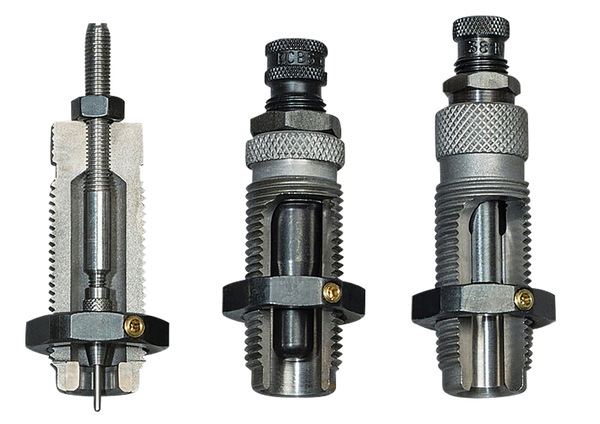 The 3-die roll crimp set is for loading straight-wall cartridges.Its steel sizer die sizes the case and de-primes.Note: cases must be lubricated.The expander die expands the case to the proper diameter to accept the bullet, and it imparts case mouth flare/bell for bullet feeding.The seater die seats the bullet and roll crimps.
