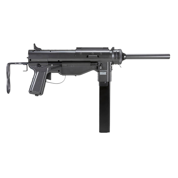The legends m3 grease gun from umarex airguns is based on the m3a1 variation used from 1944 and beyond.Underneath the dust cover resides the bolt and its cut-away thumb charging slot.This blowback action smg does fire from the open bolt just like the m3 firearms did.Noteworthy features include the collapsible wire stock, drop-free 60 round magazine, fixed peep style sights, and a 1,050 bb per minute rate of fire.Like other legends smgs, the m3 grease gun is powered by (2) 12-gram co2 cartridges.Expect to shoot approximately 120 bbs (three magazines) for each full co2 charge.